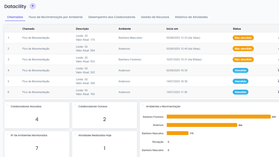 Tenha uma visão 360º da sua operação em tempo real. Acompanhe os principais KPIs, como colaboradores alocados, ambientes monitorados e chamados abertos por "Pico de Movimentação", tudo em um único painel centralizado.