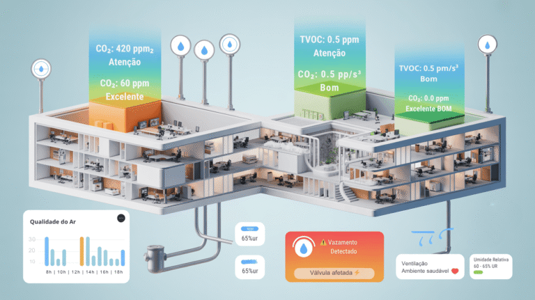 Garanta um ambiente saudável monitorando a Qualidade do Ar Interno (CO2, TVOC) e detecte vazamentos de água antes que causem danos estruturais, protegendo seu patrimônio e seus ocupantes.