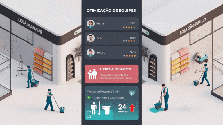 Monitore o Desempenho dos Colaboradores (limpeza/manutenção) em cada unidade. Receba Chamados automáticos de “Pico de Movimentação” (ex: banheiros de loja) e garanta uma resposta rápida e padronizada.